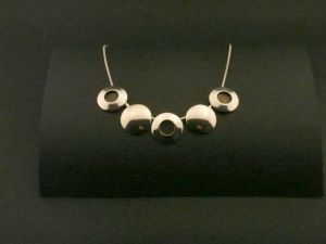 Bezeichnung: Halskette mit 5 freilaufenden Anhängern. Die Anhänger sind Hohlkörper.Bei drei von ihnen ist die Mitte geschwärzt.