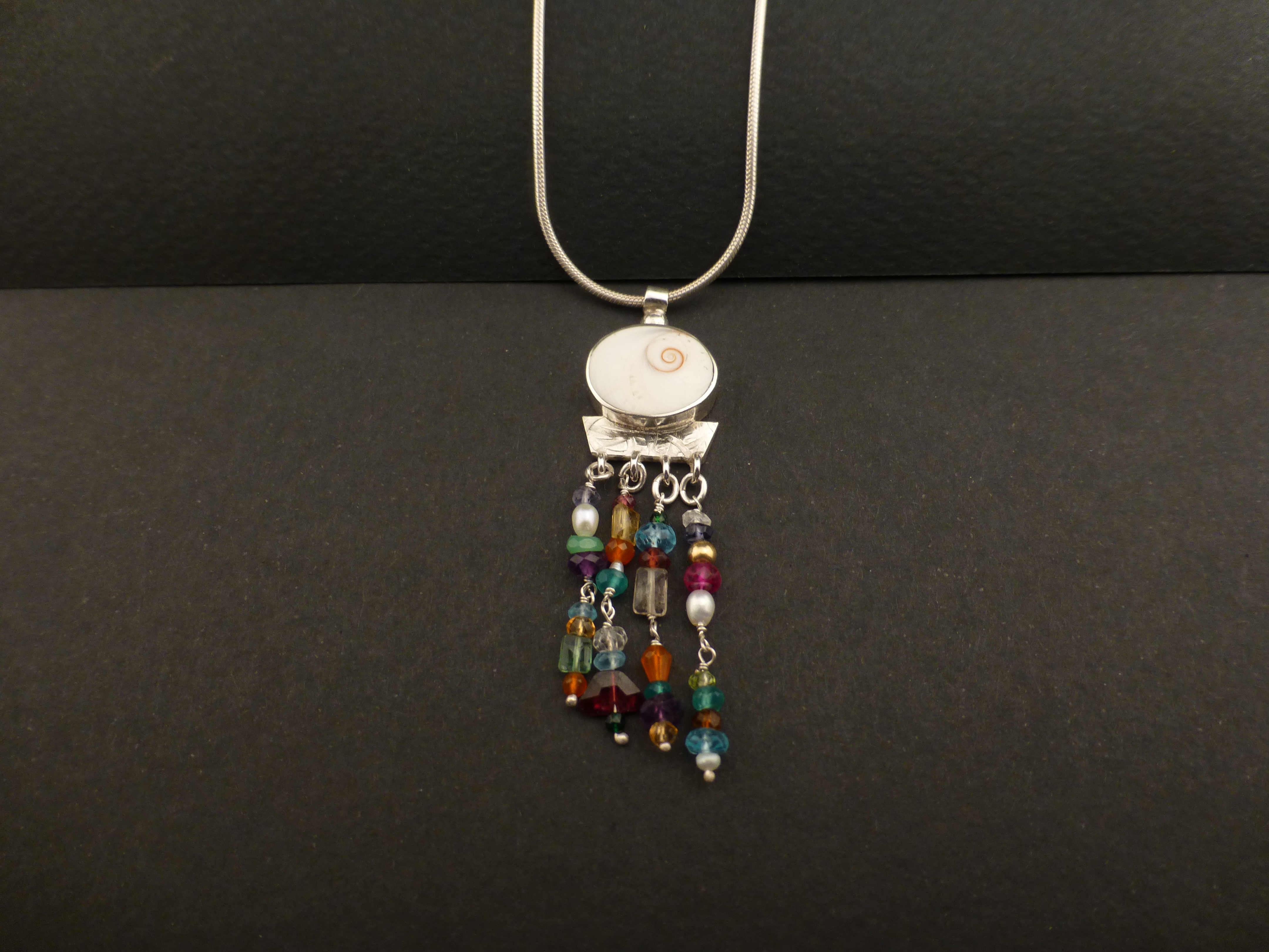 Bezeichnung: Meeresaugen Anhänger an einer Silberkette mit den Steinen: Apatit, Citrin, Iolit, Peridot, Turmalin, Mondstein.