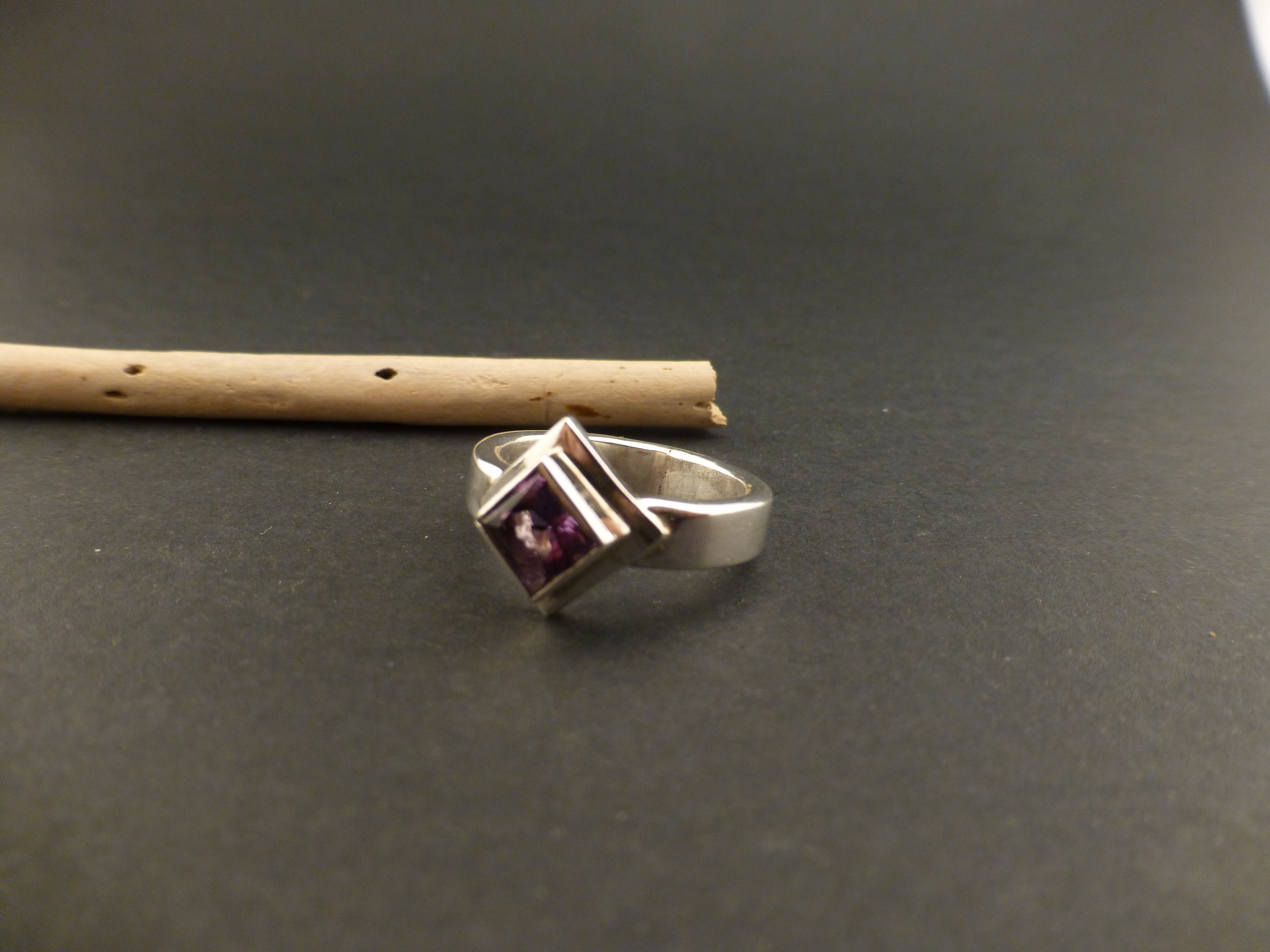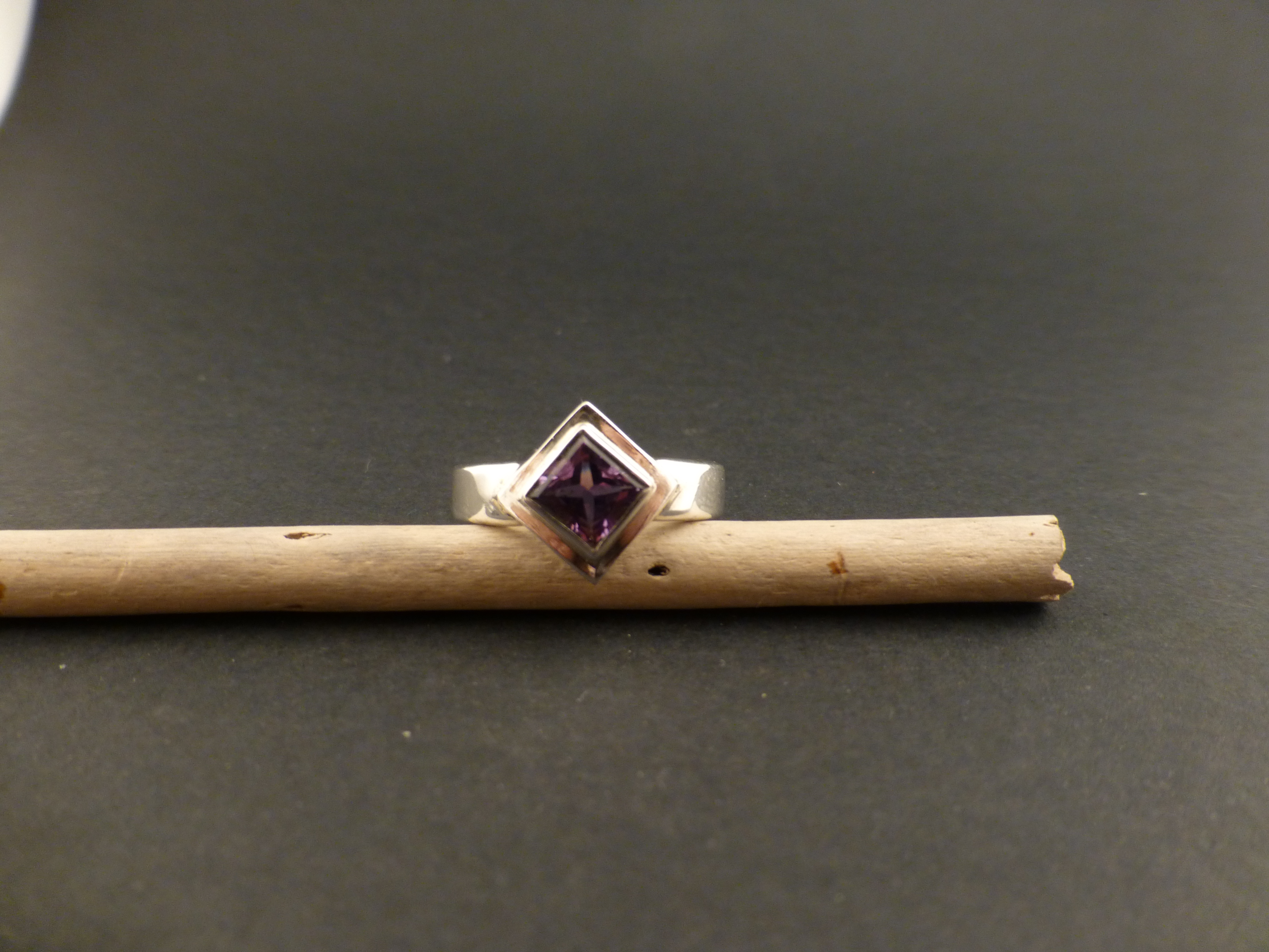 Bezeichnung: Silberring mit einen in Silber gefassten Amethyst. Lieferbar mit den Steinen: Citrin, Peridot.Rhodolith,Topas blau.
