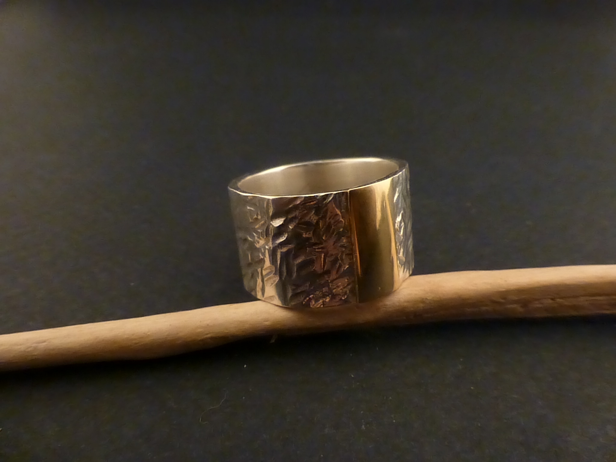 Bezeichnung: Silberring mit gehämmerter Oberfläche und Goldstreifen.