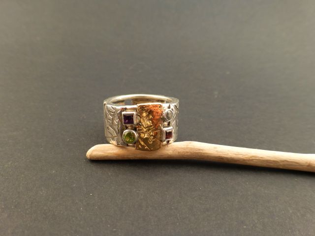 Bezeichnung: Breiter Ring aus gehämmertem Silber und Gold mit 4 Steinen: 2x quadratisch, 2x rund.