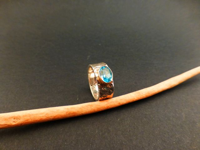 Beueichnung: Silberring mit gehämmerter Ringschiene und einen in Gold gefassten Blautopas.