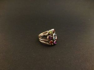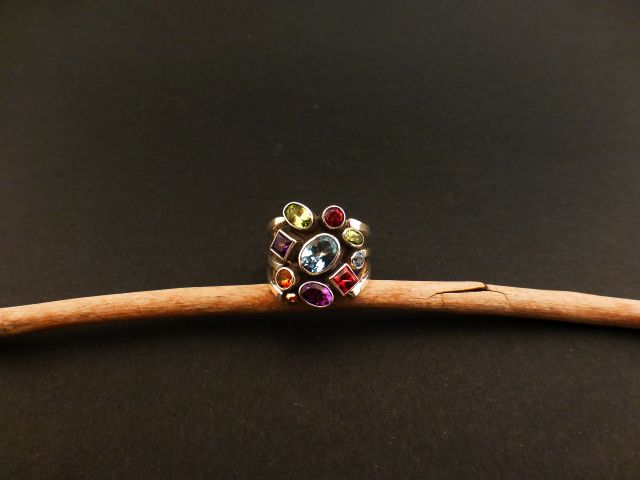 Bezeichnung: Silberring mit 3 Ringschienen und 9 Steinen in verschiedenen Größen und Formen. Steine: Amethyst,Citrin, Peridot, Rhodolith, Blautopas und eine Goldkugel als zusätzliche Verzierung.