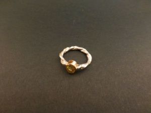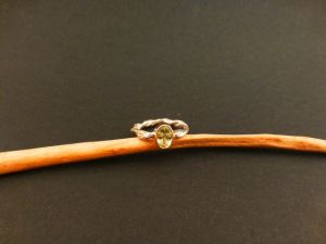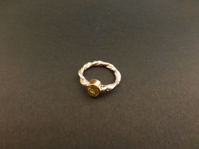 Bezeichnung: Silberring mit einer verdrehten, gehämmerten Ringschiene und einen in Gold gefassten Beryll.