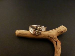 Bezeichnung: Silberring mit gehämmerter Oberfläche und versetzter Ringschiene die durch einen Golddraht gehalten wird.
