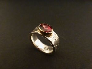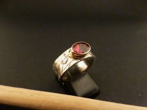 Bezeichnung: Silberring mit gehämmer Ringschiene und einen in Gold gefassten Rhodolith.