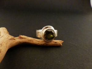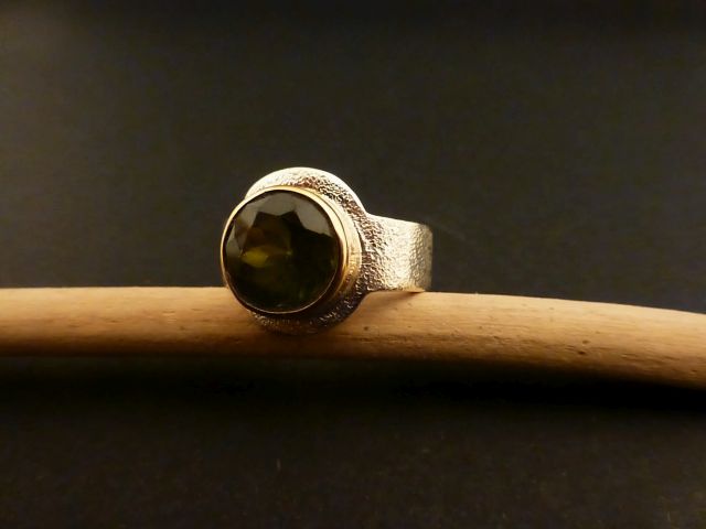 Bezeichnung: Silberring mit ziselierter Oberfläche und einen in Gold gefassten Idokras.