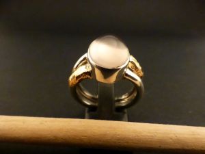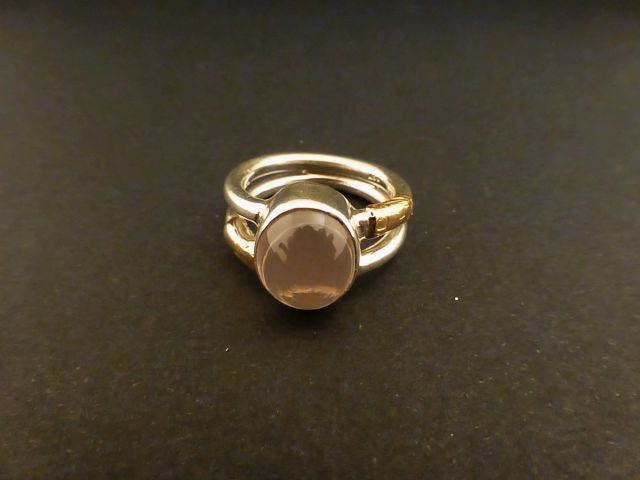 Bezeichnung: Silberring mit 2 runden Ringschienen und einer Goldverzierung. Der Stein ist ein Rosenquarz Cabochon.