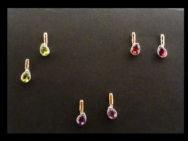 Bezeichnung: Silberohrstecker mit den Steinen (birnform) ,Peridot, Amethyst, Granat und einer Goldverzierung.