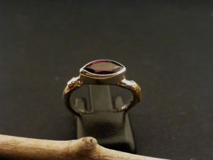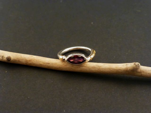 Bezeichnung: Feiner Silberring mit Granat (navette) und einer Goldverzierung.