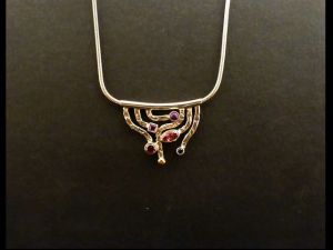 Bezeichnung: Frei laufender Anhänger mit 2 x Granat, 2 x Amethyst, 1 x Saphir und einer Goldkugel.