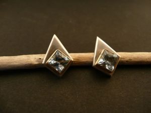Bezeichnung: Silberohrstecker mit Blau-Topas (birnform) und einer Goldverzierung am Steg.